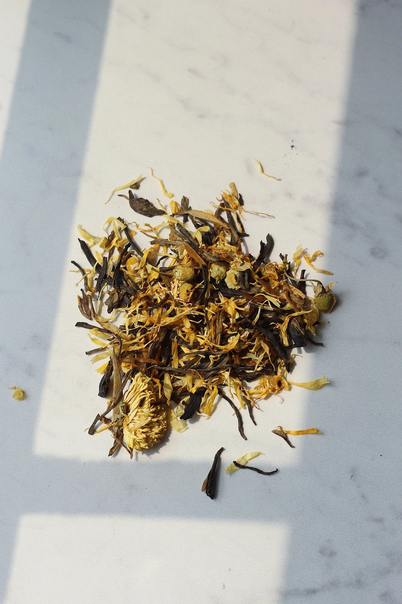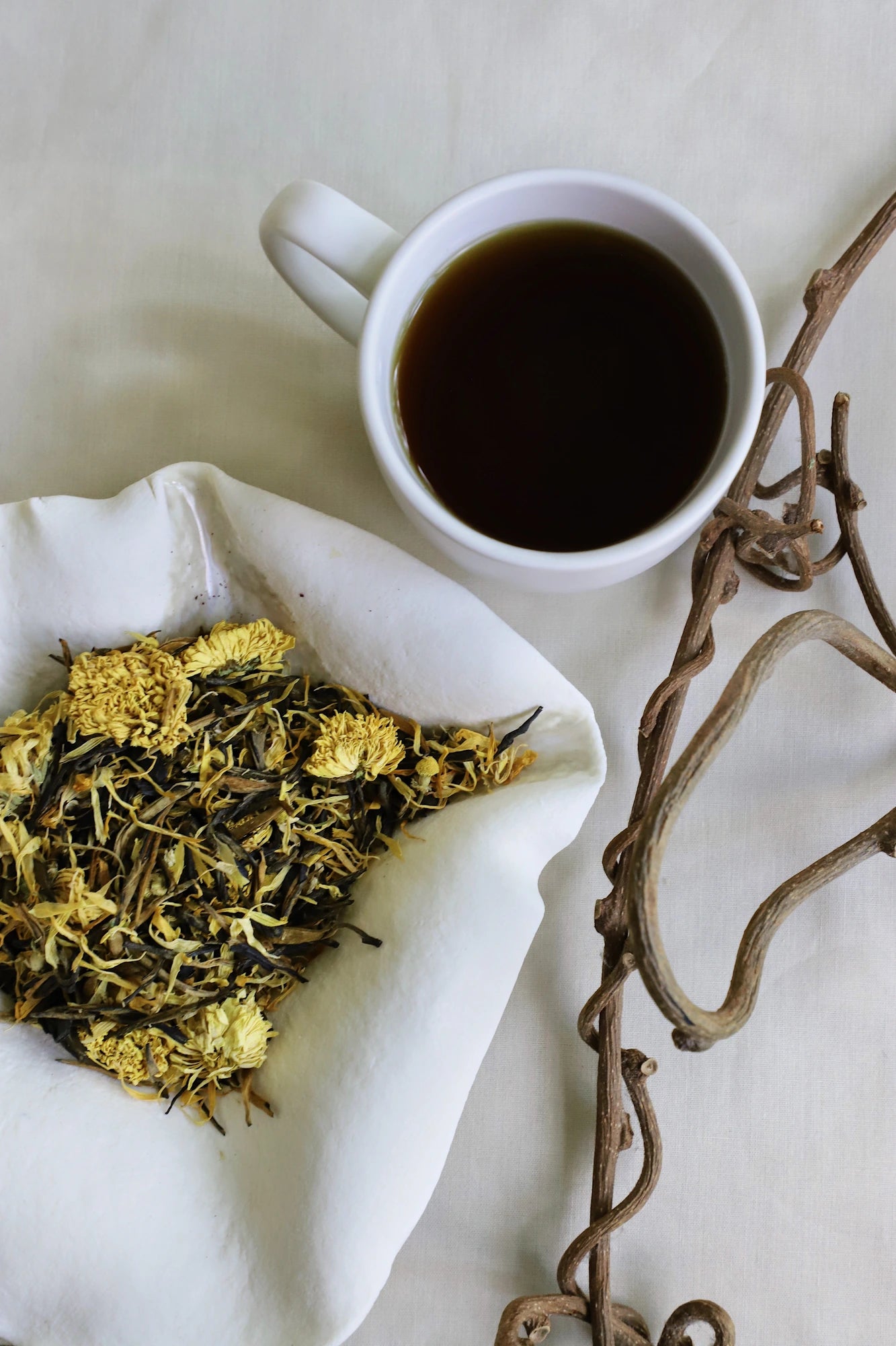 Unwind and savor the fine balance of artisanal hand-crafted Yunnan Black Tea, combined with Chrysanthemum, Calendula, and Chamomile. This delicious blend has smooth milk chocolate and vanilla flavors, with a gentle floral and lingering honey-like finish. Each Spring season, the tea leaves are picked from an organic and biodiverse farm. Artisan Wildflower Yunnan is the ultimate blend of soothing, relaxing florals and mellow black tea leaves.